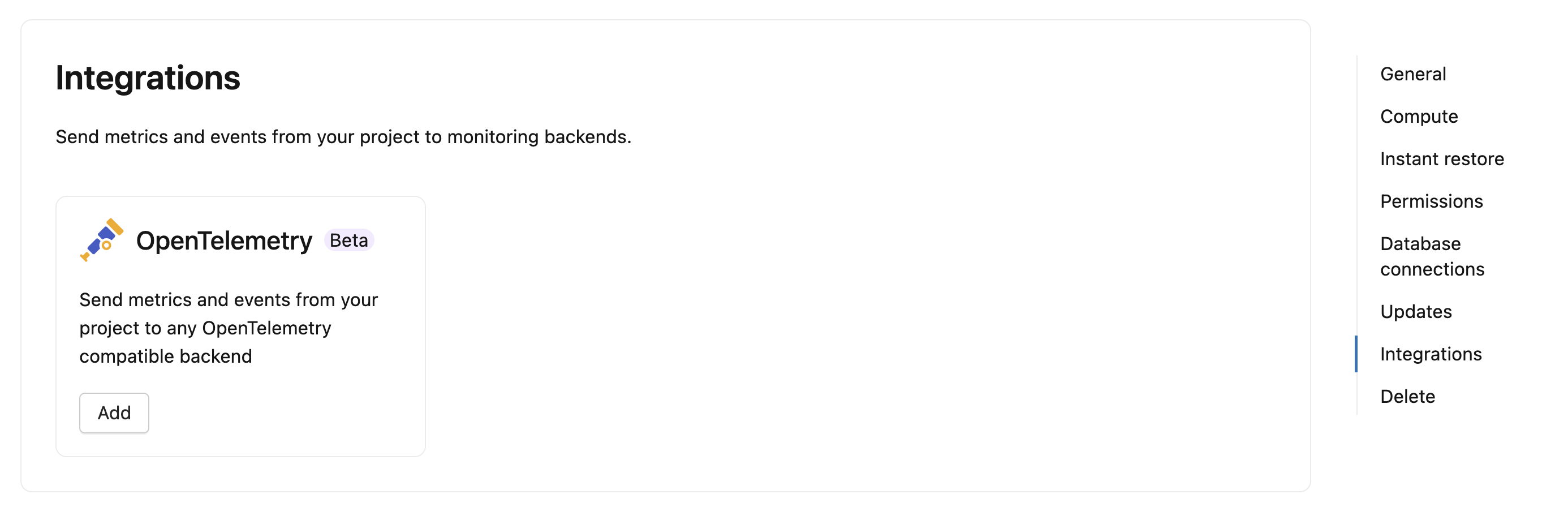- Go to Settings for the project, then go to Integrations. The OpenTelemetry integration is available in the Integrations section.