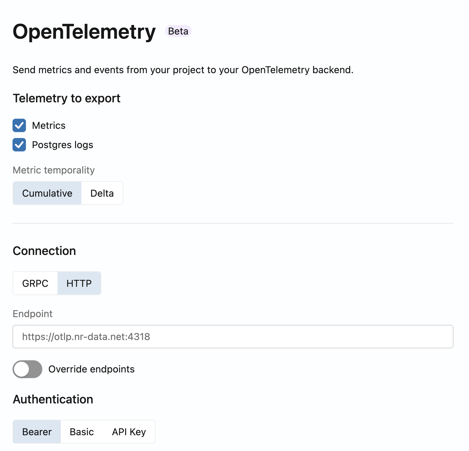 OTEL_EXPORTER_OTLP_ENDPOINTor the gateway URL on the OpenTelemetry page). Don't append/v1/metricsor/v1/logs; Lakebase adds those paths. Hostnames often followhttps://otlp-gateway-<region>.grafana.net/otlp; use the exact URL from your stack because region and hostname vary. - Authentication — Use the method Grafana documents for your token: Basic if Grafana gives a username and password (for example instance ID and token), Bearer for a bearer token, or API Key with a custom header name if Grafana specifies a non-default header. For Basic authentication, Grafana might provide a base64-encoded value that you need to decode before using.