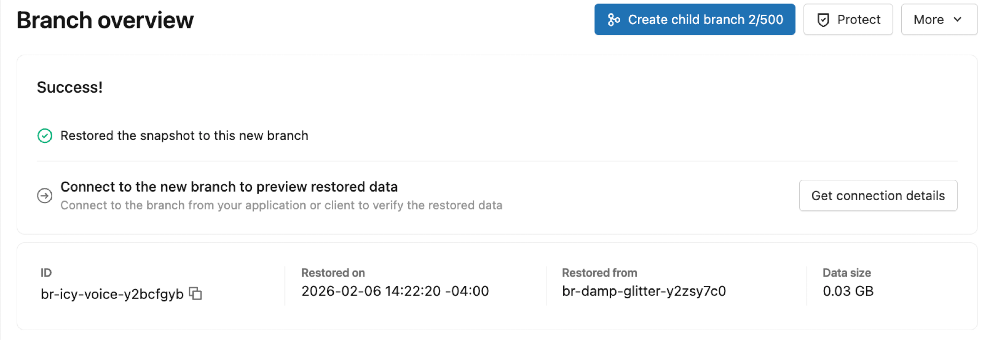 - Point your application to the new branch. Once you are sure the data is correct, update your application's connection settings to use this branch's connection details.