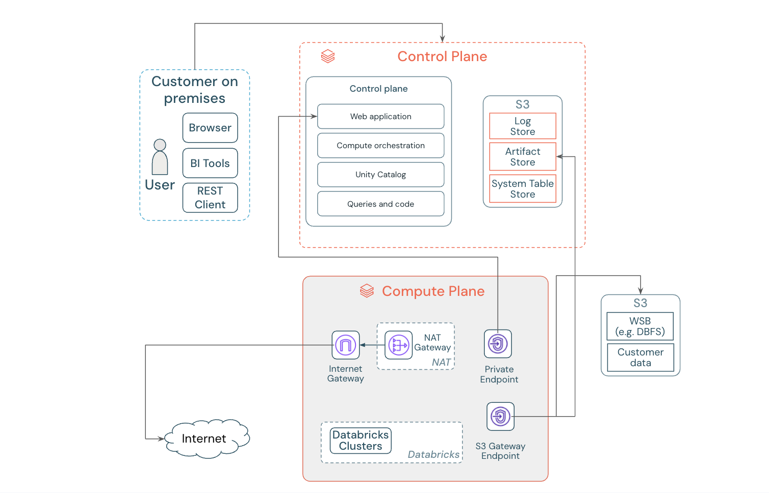 - Network perimeter hardening: Implementing classic compute plane PrivateLink alongside VPC endpoints for AWS services (such as S3, STS, and Kinesis) allows you to remove internet gateways from your VPC. This reduces data exfiltration risks by ensuring that data-processing clusters have no path to unauthorized services or destinations on the public internet.