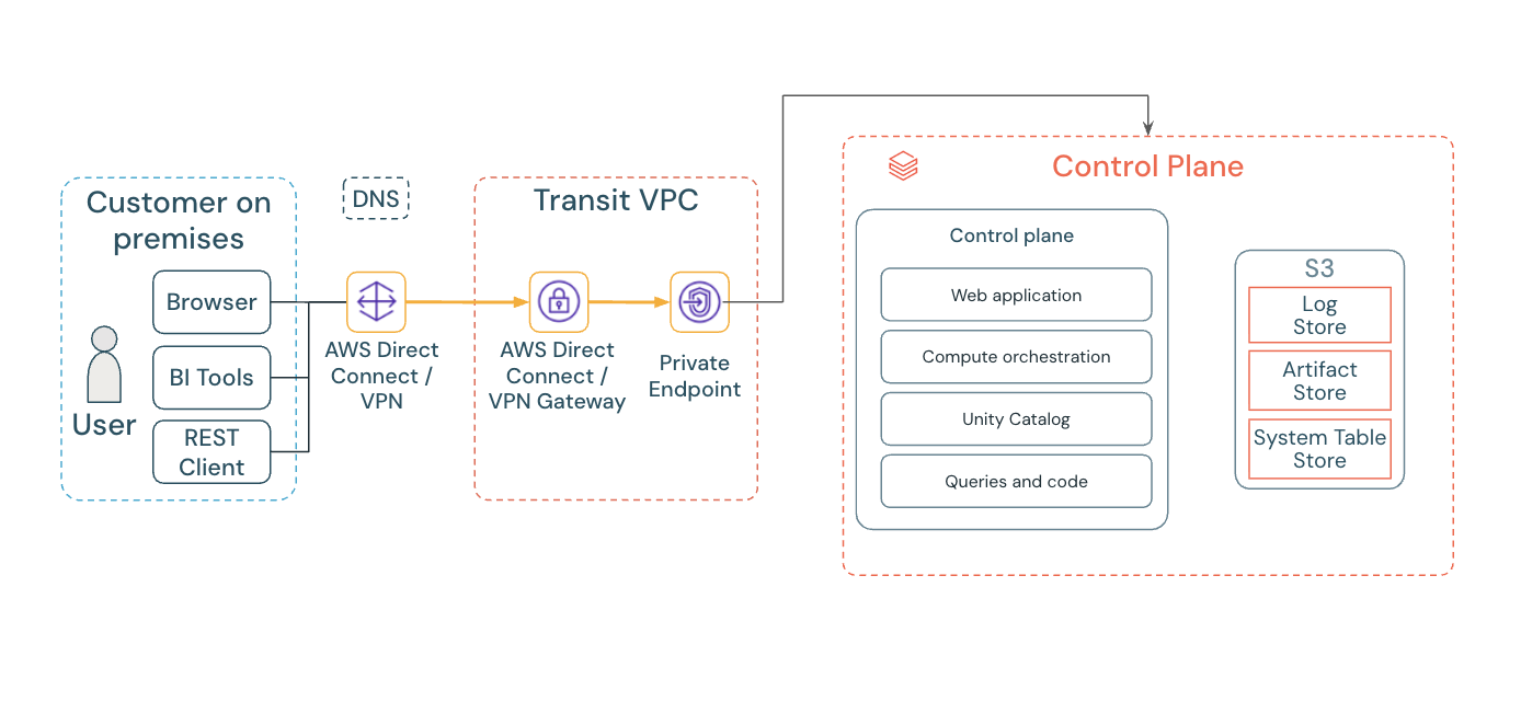 Inbound PrivateLink secures the connection from users to the Databricks workspace. Traffic routes through a VPC interface endpoint in your transit VPC instead of public IPs. Inbound PrivateLink provides secure access to: