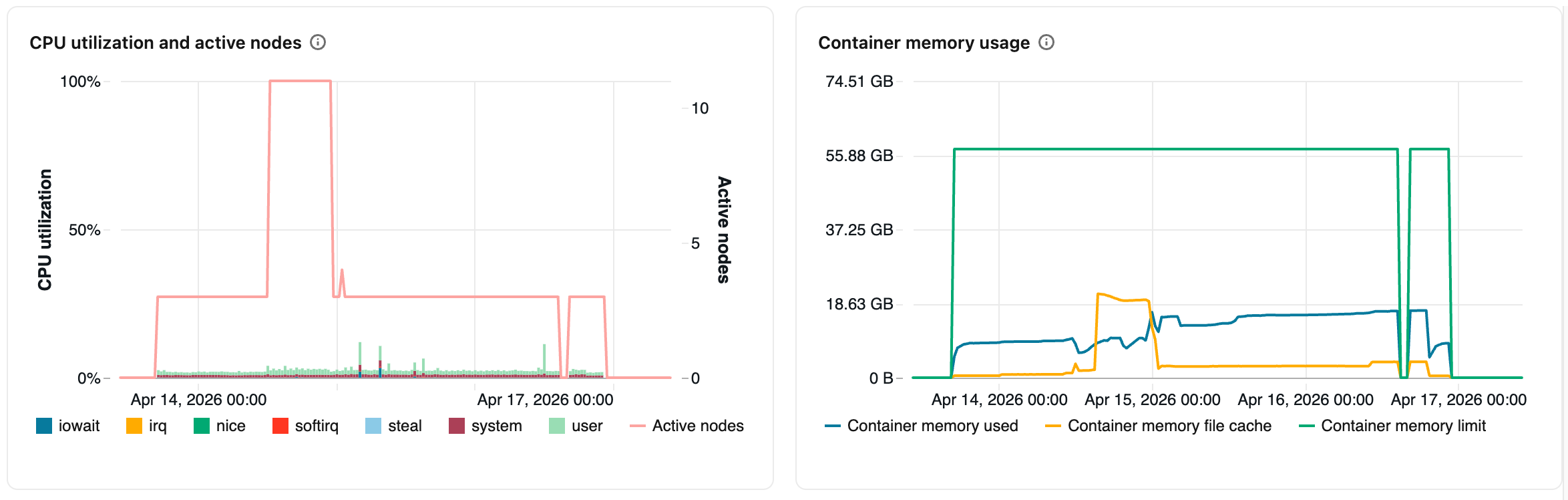 CPU使用率とアクティブノード :折れ線グラフは、指定されたコンピュートの各タイムスタンプにおけるアクティブノードの数を表示します。 棒グラフは、CPUが各モードで費やした時間の割合を、総CPU秒数に基づいて表示します。追跡対象となるモードは以下のとおりです。