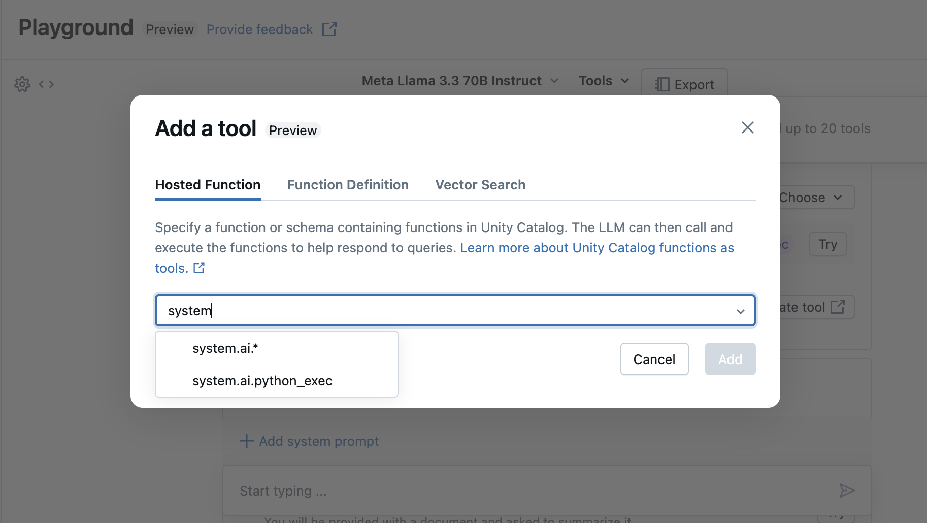 system.ai.python_execを選択します。 この関数により、エージェントは任意の Python コードを実行できるようになります。エージェント ツールを作成する方法については、 「ツール アプローチの選択」を参照してください。