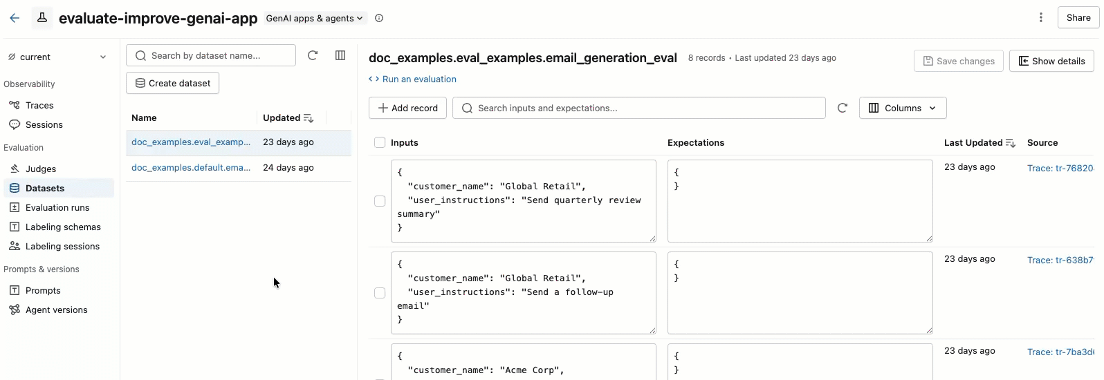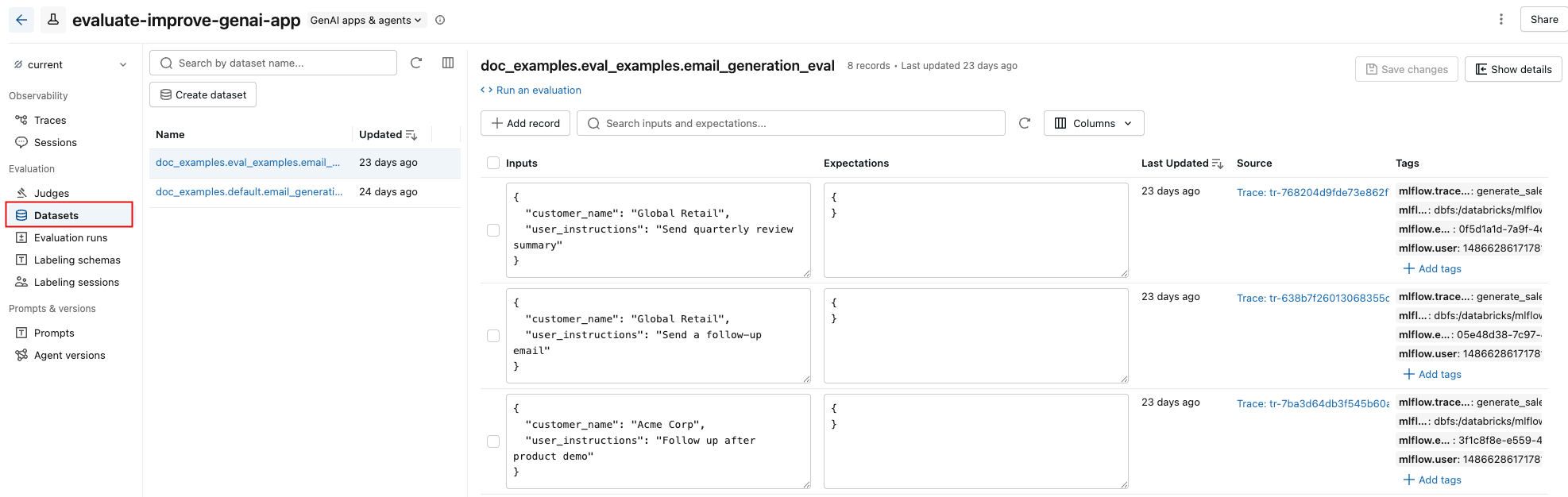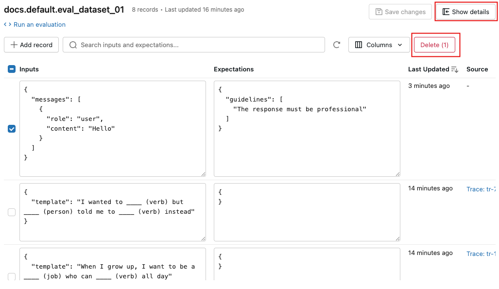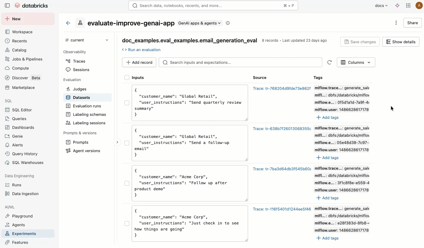右側のペインから、レコード入力と期待値をインラインで編集したり、個々のレコードにタグを追加したり、本番運用トレースから作成されたレコードのソース トレースを表示したり、データセットに対して評価を実行するためのすぐに使用できるPythonコード スニペットを取得したりできます。