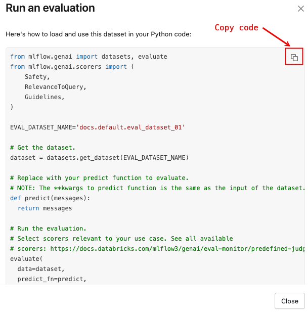 データセットを読み込み、デフォルトのスコアラーセットを使用してmlflow.genai.evaluate()を実行するPythonコードテンプレートを含むダイアログを開くには: