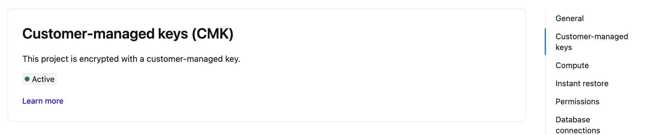Lakebaseユーザーは、CMKを直接設定する必要はありません。プロジェクトが現在CMKで暗号化されているかどうかを確認するには: