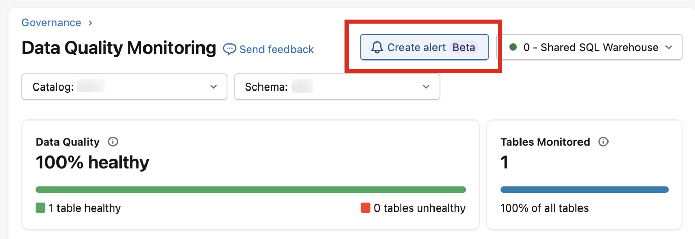 Navegue até o esquema para o qual deseja criar um alerta no Explorador de Catálogo. O monitoramento da qualidade dos dados deve estar ativado para este esquema.