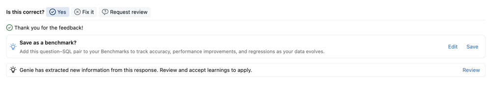 Genie também aprende com as interações do autor em conversas. Quando um autor aprova uma resposta ou downloads os resultados de uma consulta, Genie analisa a consulta e identifica a lógica útil que pode melhorar a precisão em perguntas futuras. Isso pode sugerir novas expressões SQL (medidas, filtros ou dimensões), bem como relações join adicionais para adicionar ao repositório de conhecimento.