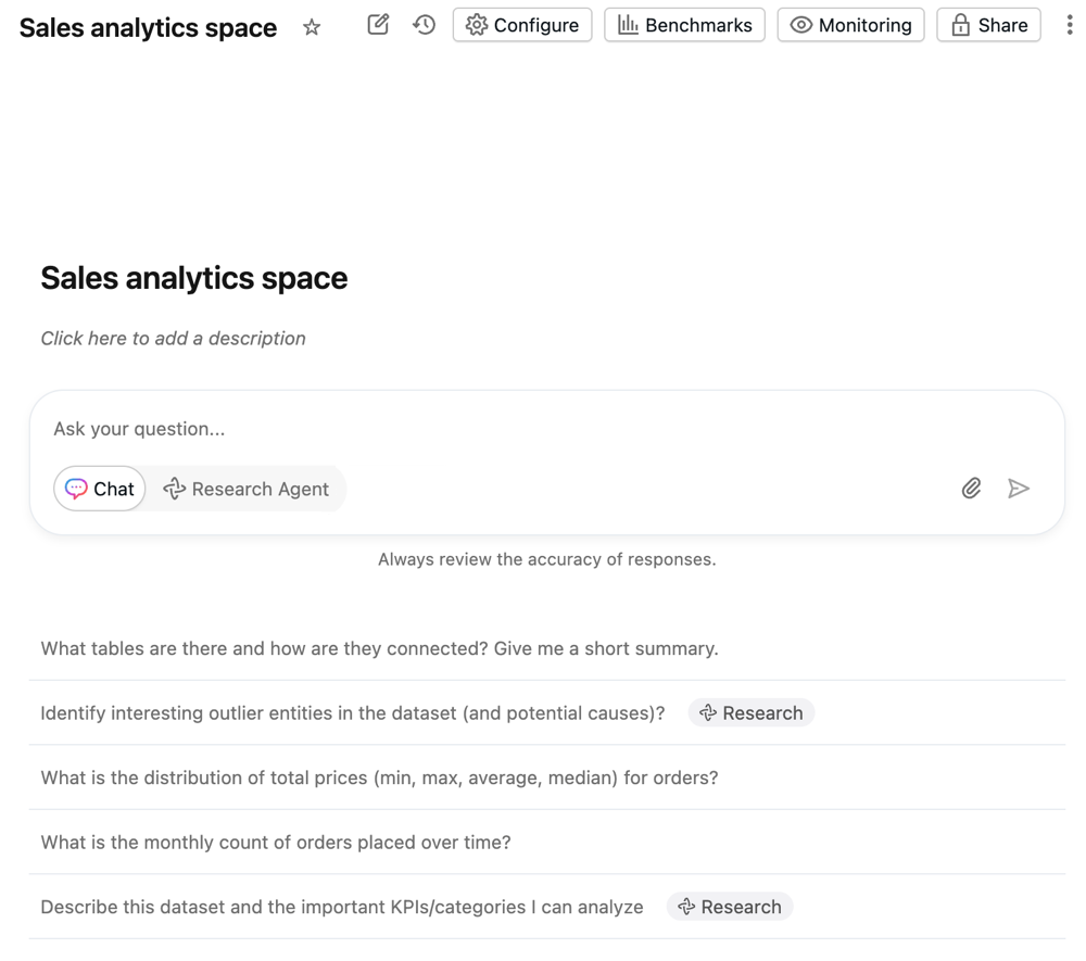 O espaço do Genie deve ser repetido com base em testes e uso. Para obter orientação sobre as práticas recomendadas para criar e iterar em um espaço, consulte Curadoria de um espaço Genie eficaz.