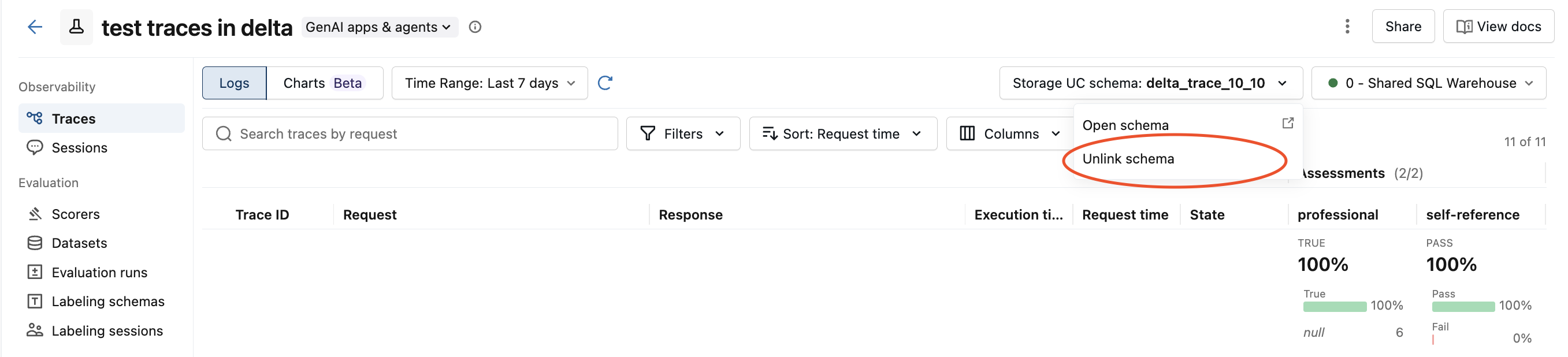 Se você armazenou seus rastreamentos em uma tabela Unity Catalog, Databricks recupera os rastreamentos usando um SQL warehouse. Selecione um SQL warehouse no menu suspenso.