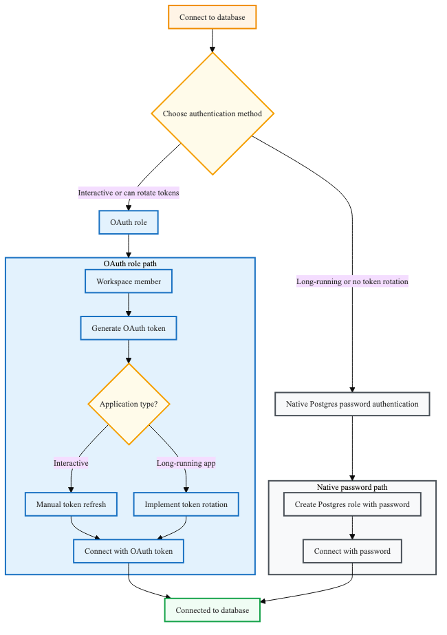 OAuth oferece expiração automática de credenciais e integração de identidade workspace , mas requer rotação de tokens para aplicativos de longa duração. As senhas do Postgres não expiram nem precisam ser rotacionadas, mas não possuem a expiração automática e o gerenciamento de segurança centralizado do OAuth.