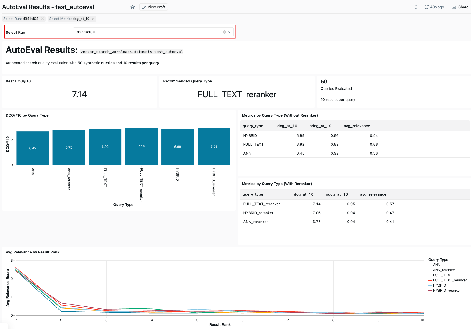 Mosaic AI Vector Search oferece uma avaliação integrada da qualidade da recuperação, que mede e compara a relevância de diferentes estratégias de busca em seus dados. Você pode gerar automaticamente consultas de avaliação a partir de seus documentos, executar múltiplas estratégias de recuperação e gerar um relatório detalhado.