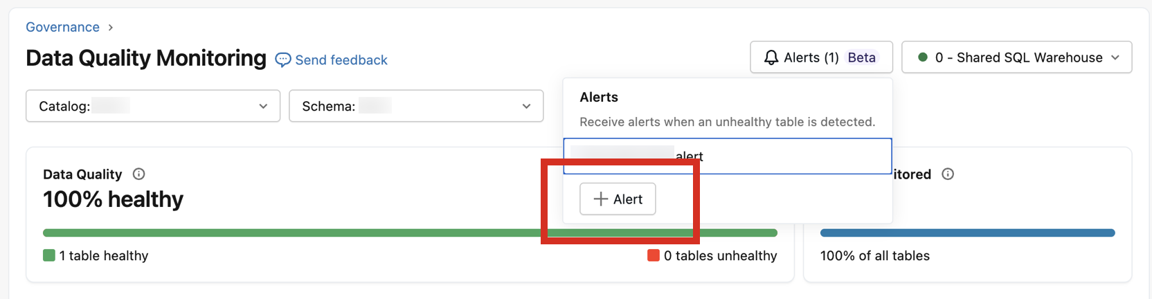 Navigate to a schema that you want to create an alert for in Catalog Explorer. Data quality monitoring must be enabled for this schema.
