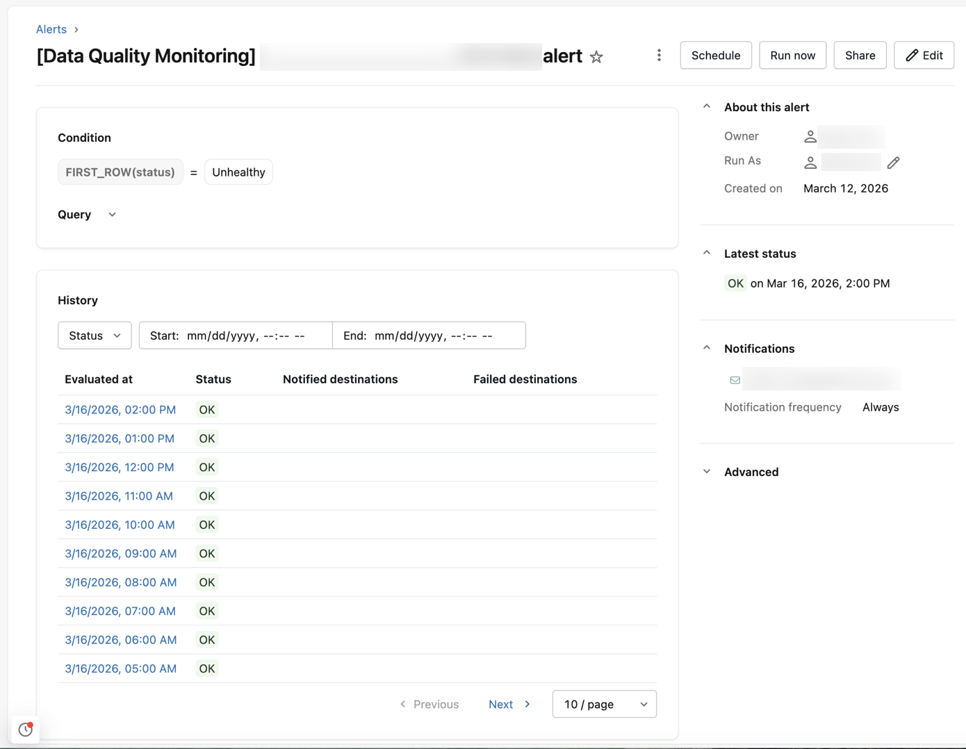 - Data Quality Monitoring UI (Beta): Create and view alerts directly from the Data Quality Monitoring UI without leaving the page. See Create an alert in the Data Quality Monitoring UI.