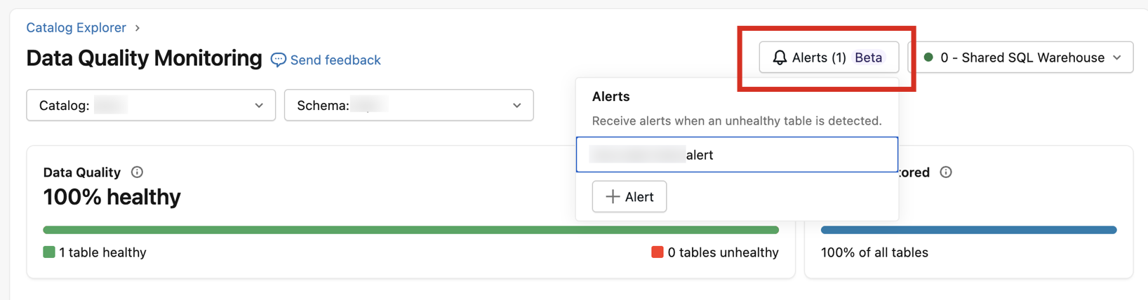 従来のベータ ジョブの場合、既存のアラート構成でsystem.data_quality_monitoring.table_results <catalog>.<schema>._quality_monitoring_summaryに置き換える必要があります。
