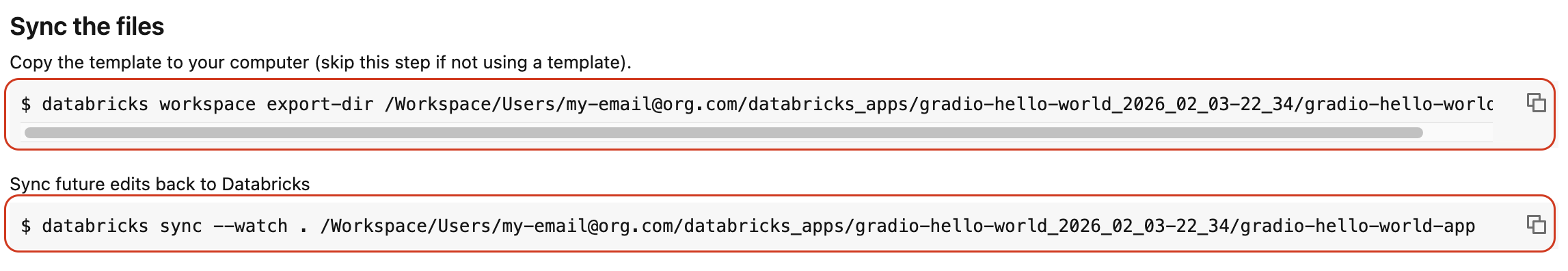 最初のコマンドは、ワークスペースからローカル ディレクトリに 3 つのファイル ( app.pyapp.yamlrequirements.txt ) をエクスポートします。2 番目のコマンドは、ローカル ファイルの変更を監視し、それらをワークスペースに自動的にアップロードする同期プロセスを開始します。
