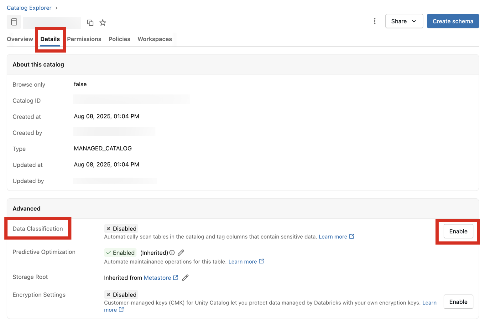 - Para habilitar a classificação de dados, você deve ser o proprietário do catálogo ou ter privilégios