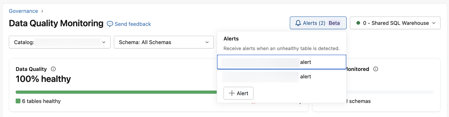 Navegue até o esquema para o qual deseja criar um alerta no Explorador de Catálogo. O monitoramento da qualidade dos dados deve estar ativado para este esquema.