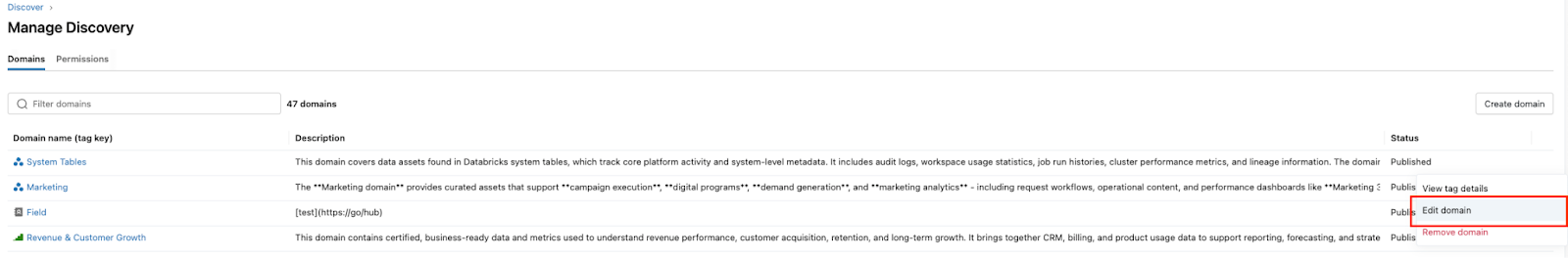 - Navegue por domínios, uma camada organizacional alinhada aos negócios onde você pode organizar dados ativos (por exemplo, tabelas, painéis e Genie spaces) para atender às necessidades da empresa.
