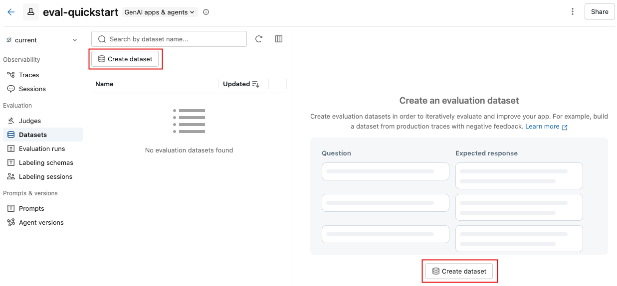 Para adicionar rastreamentos existentes a um dataset de avaliação, consulte Criar um dataset usando a interface do usuário.