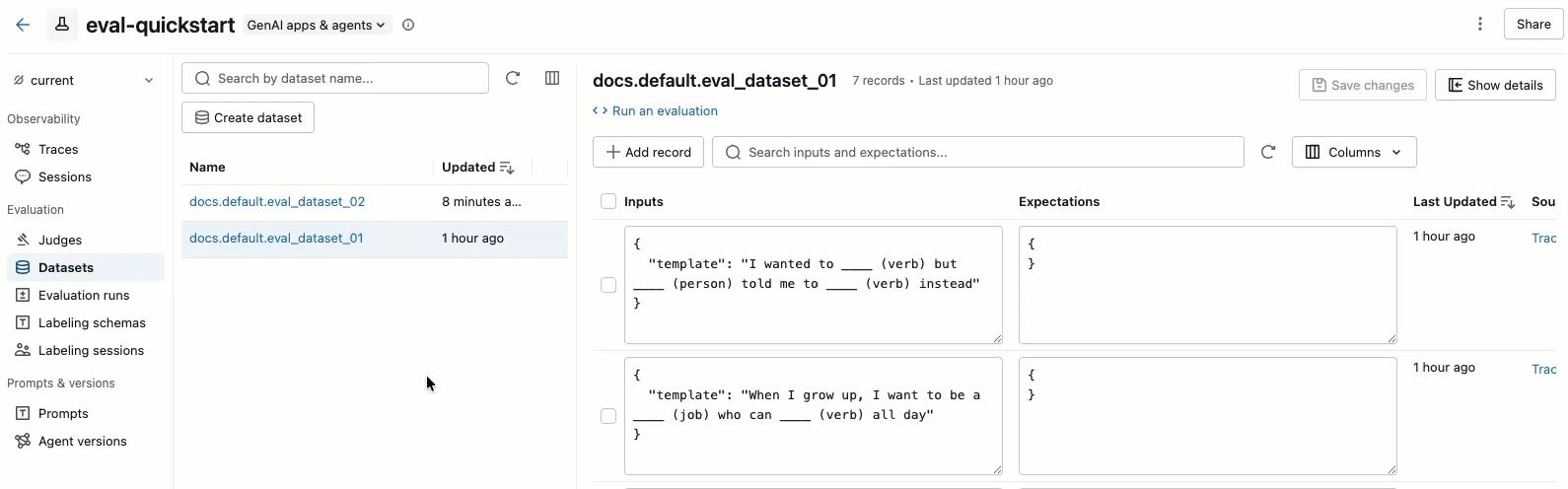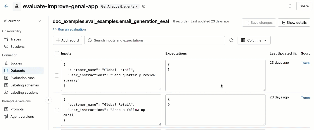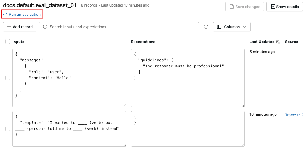 No painel direito, você pode editar as entradas e expectativas dos registros diretamente no arquivo, adicionar tags a registros individuais, view o rastreamento de origem para registros criados a partir de rastreamentos de produção e obter um trecho de código Python pronto para uso para executar uma avaliação no dataset.