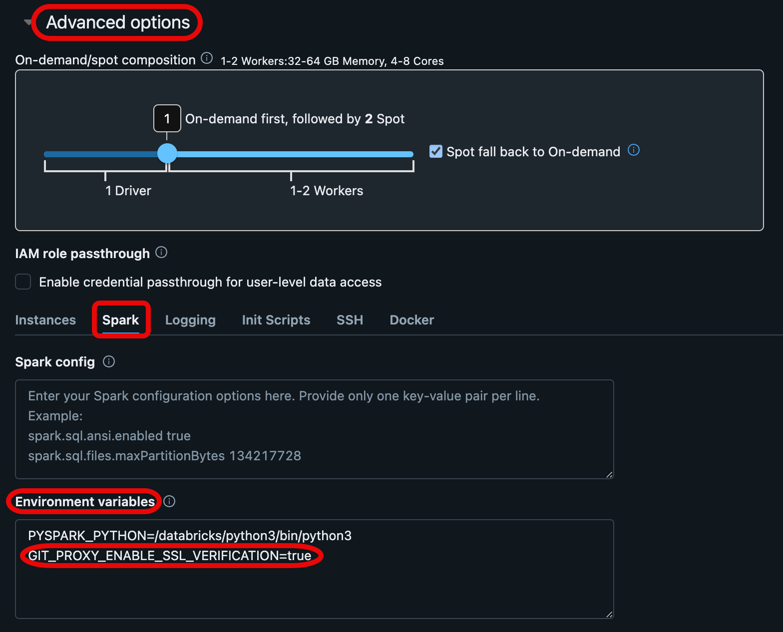 Para definir essas variáveis de ambiente, acesse o computador tab em seu Databricks workspace e selecione a configuração compute para seu serviço de proxy Git. Na parte inferior do painel Configuration , expanda Advanced e selecione o ícone Spark tab abaixo dele. Defina uma ou mais dessas variáveis de ambiente adicionando-as à área de texto variável de ambiente .